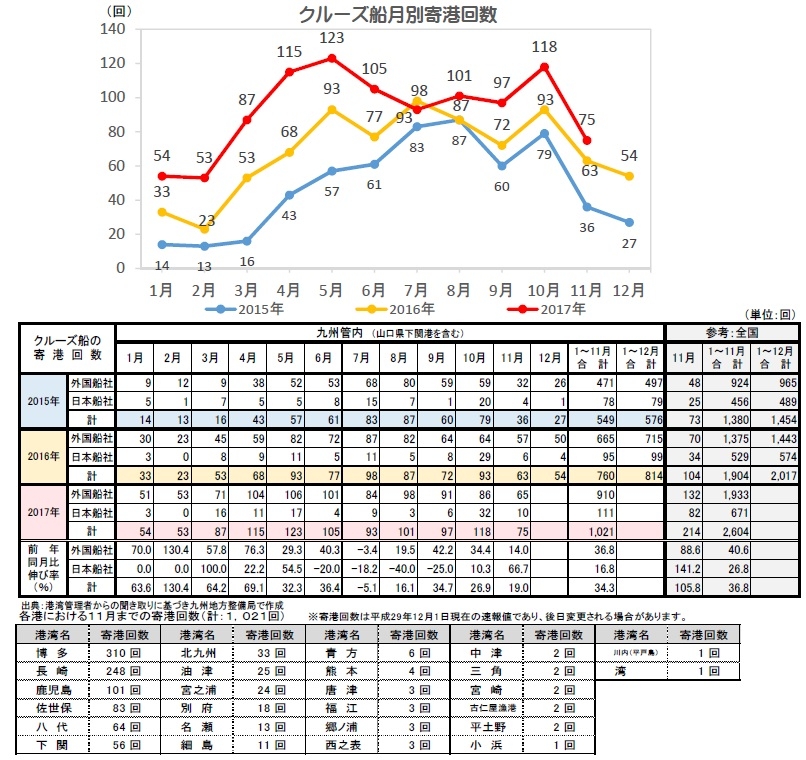 - 2017年11月までの九州管内港湾におけるクルーズ船寄港回数は、前年同期比34.3%増の1,021回。