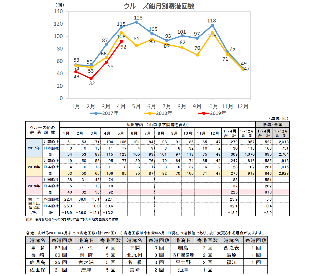 ・2019年4月の九州管内港湾におけるクルーズ船寄港回数は、前年同月比13.2%減の92回。