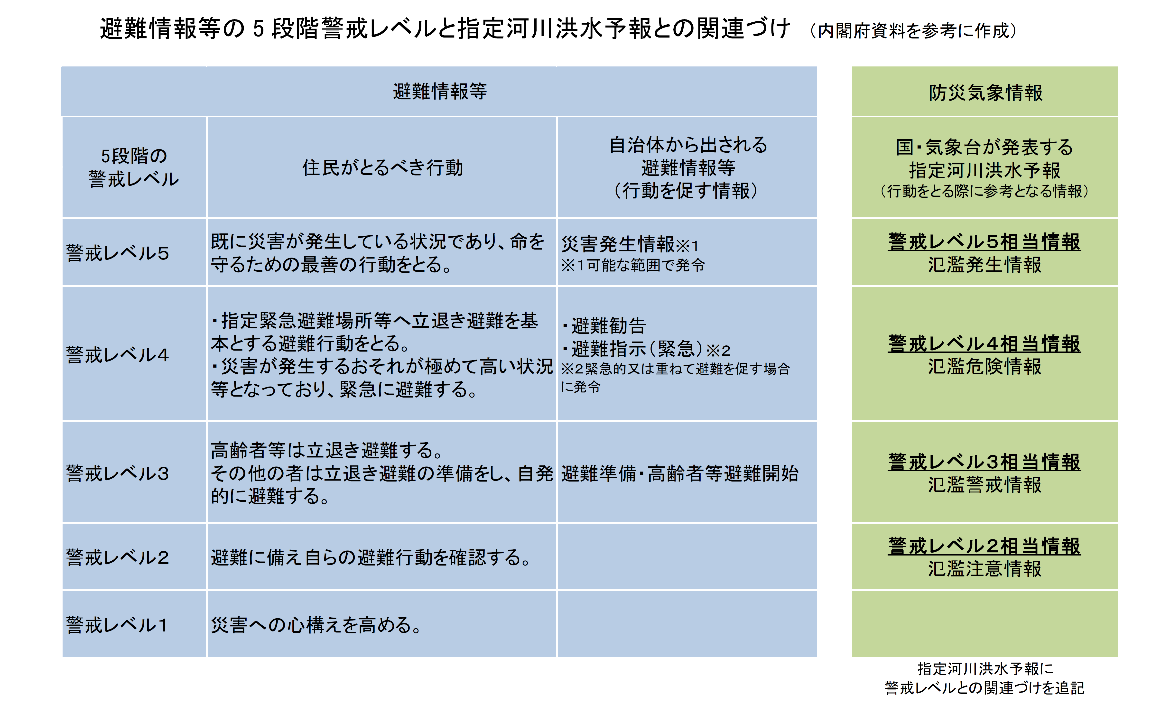 九州地方整備局と福岡管区気象台は、令和元年5月29日から指定河川洪水予報を避難情報等の5段階の警戒レベル(内閣府)に関連付けて発表します。