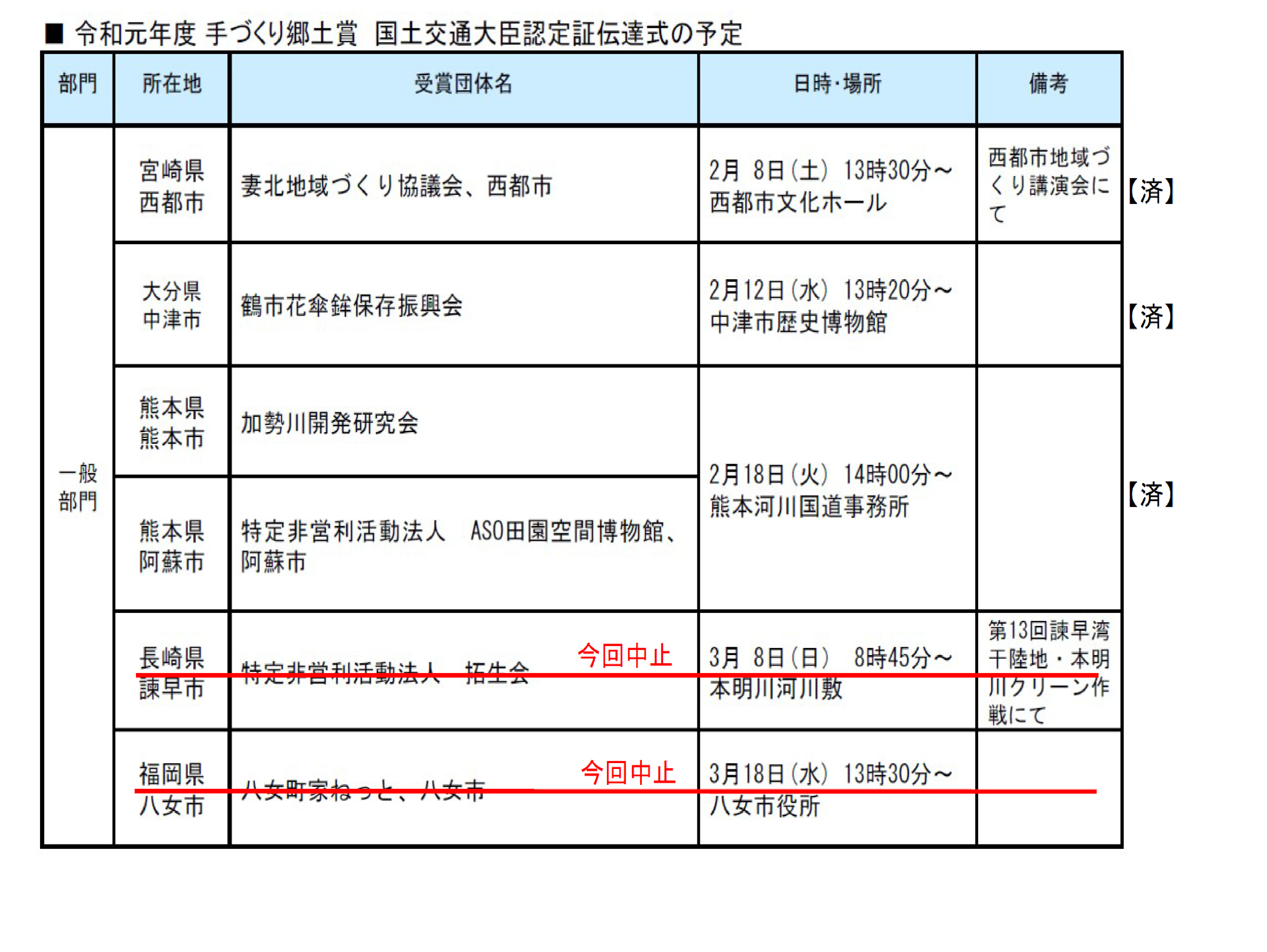 ■ 開催予定しておりました令和元年度「手づくり郷土賞」伝達式ですが、新型コロナウイルス感染防止のため、下記、2つの伝達式は開催を中止いたしますのでお知らせいたします。