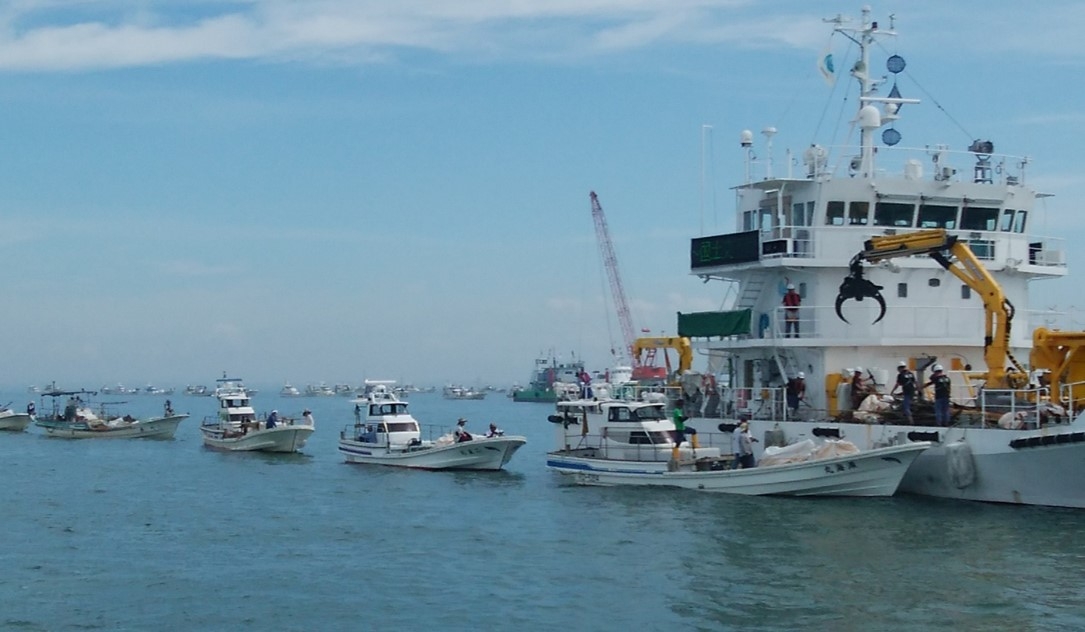 漁船が回収した漂流物の受け取り状況(写真右が海煌)