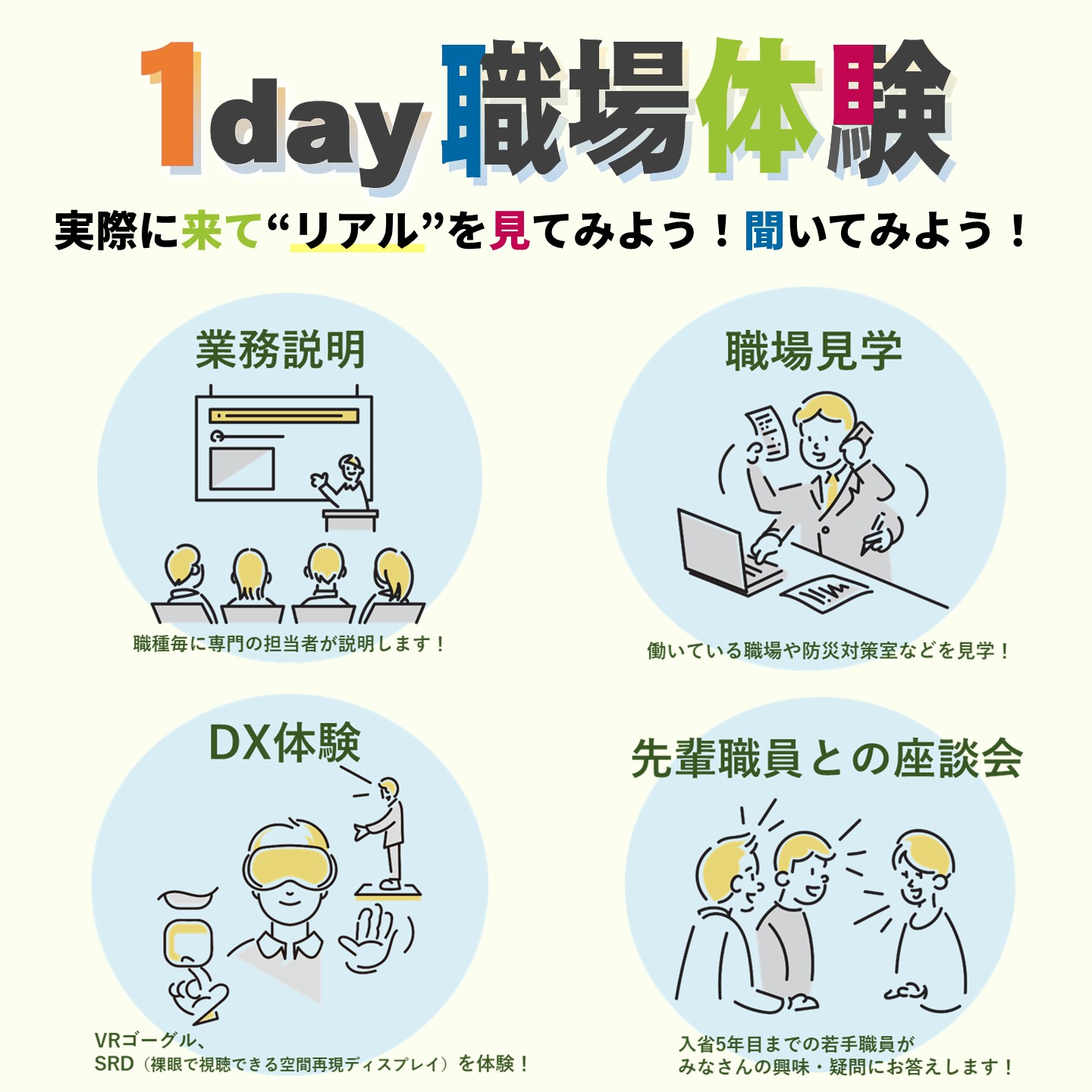 1日で職場見学・若手職員との座談会を通じて、公務員の働き方や職場の空気感を体験。