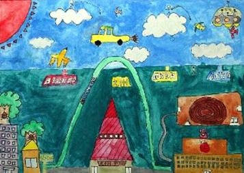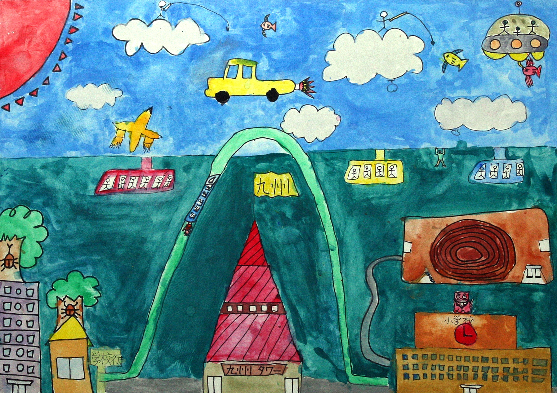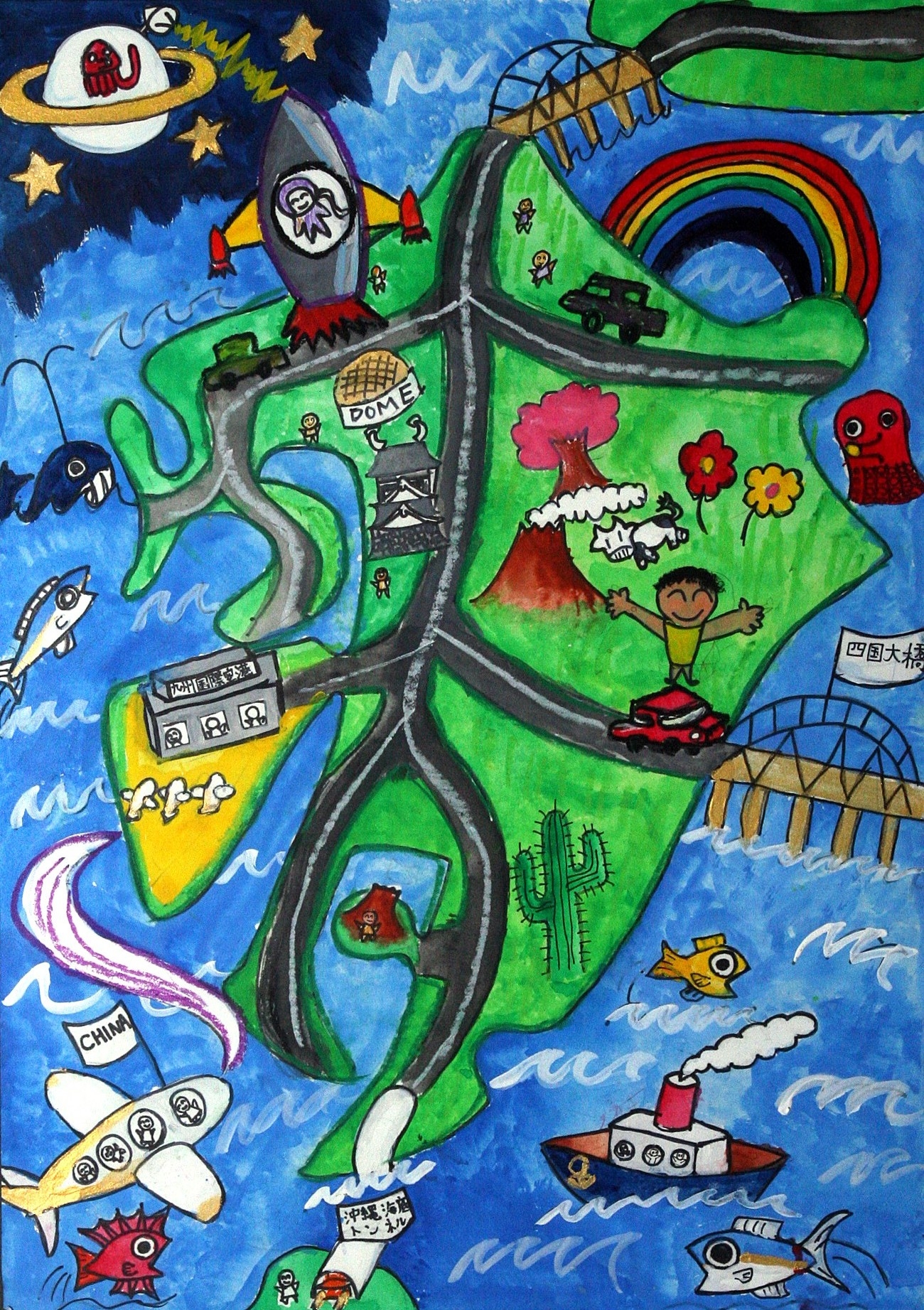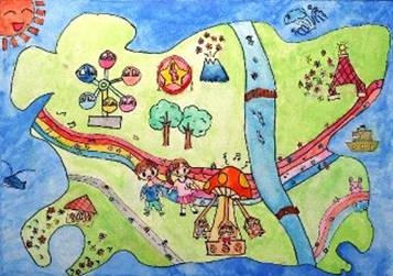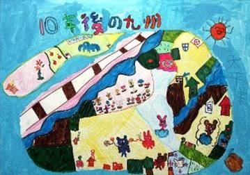 【作者コメント】九州の道が、すみずみまで整備され、九州からも四国や沖縄まで、橋やトンネルでつながり、車で行けるといいなと思って描きました。大きな道ができた先には、天草に国際空港ができて、アジアの人々がたくさん九州に遊びにくるといいと思います。九州には海や山などのすばらしい自然がたくさんあるので、僕たちはそれを守っていきたいと思って描きました。 |