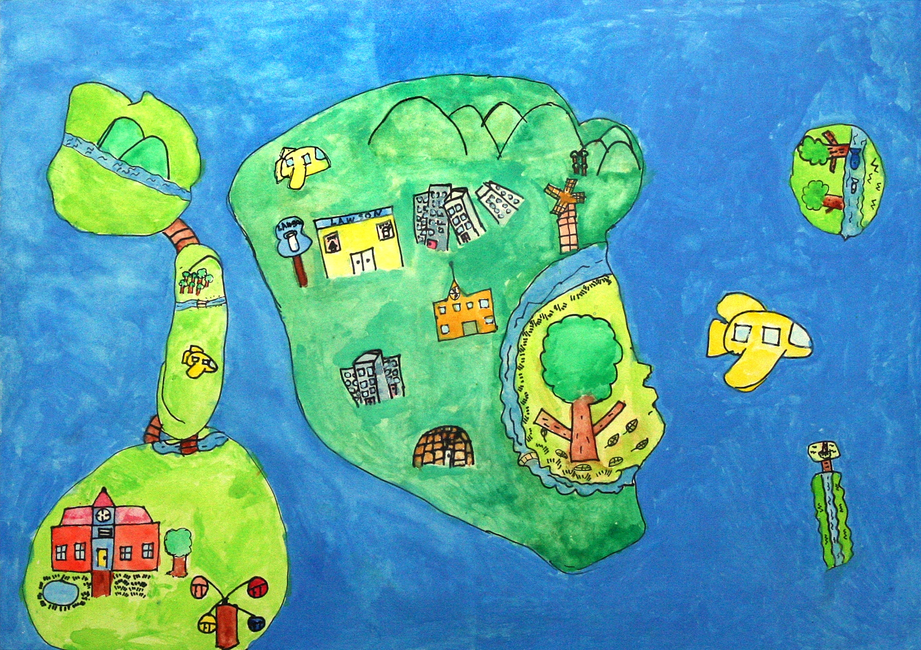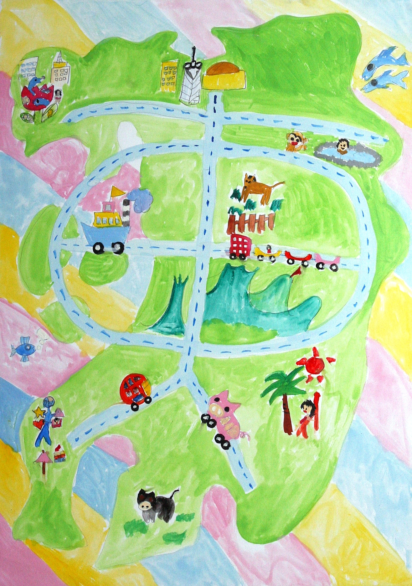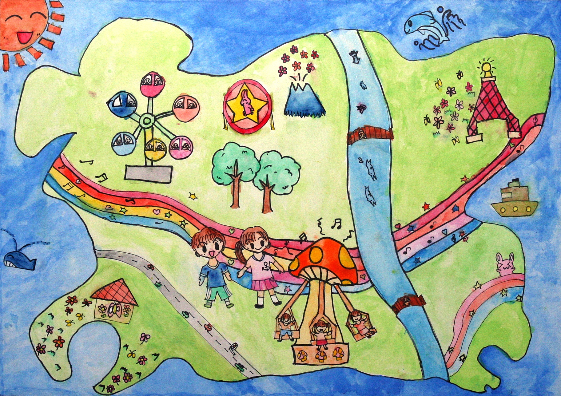 【作者コメント】九州の道が、すみずみまで整備され、九州からも四国や沖縄まで、橋やトンネルでつながり、車で行けるといいなと思って描きました。大きな道ができた先には、天草に国際空港ができて、アジアの人々がたくさん九州に遊びにくるといいと思います。九州には海や山などのすばらしい自然がたくさんあるので、僕たちはそれを守っていきたいと思って描きました。 |