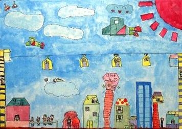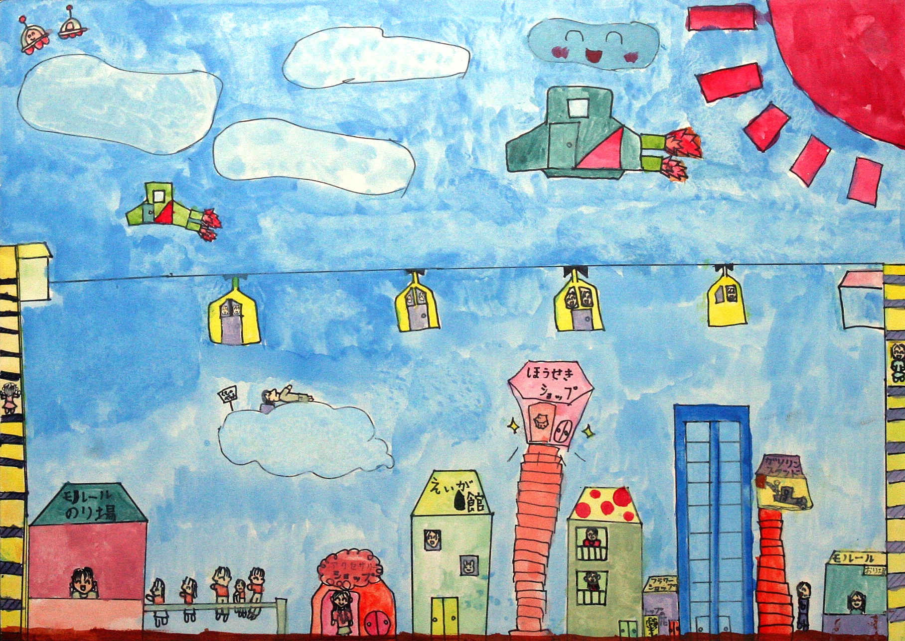 【作者コメント】都市を結ぶのは、リニアモーターカーの「もっぐん」です。地下と地上を出たり入ったりします。人々が電気自動車を運んでいます。駅は、飛行場にもなっています。エネルギーは環境を考えて、地熱、風力、潮力、ソーラーパワーを使って作り出しています。九州の未来は、自然がいっぱいな、「自然きらきらランド」です。 |