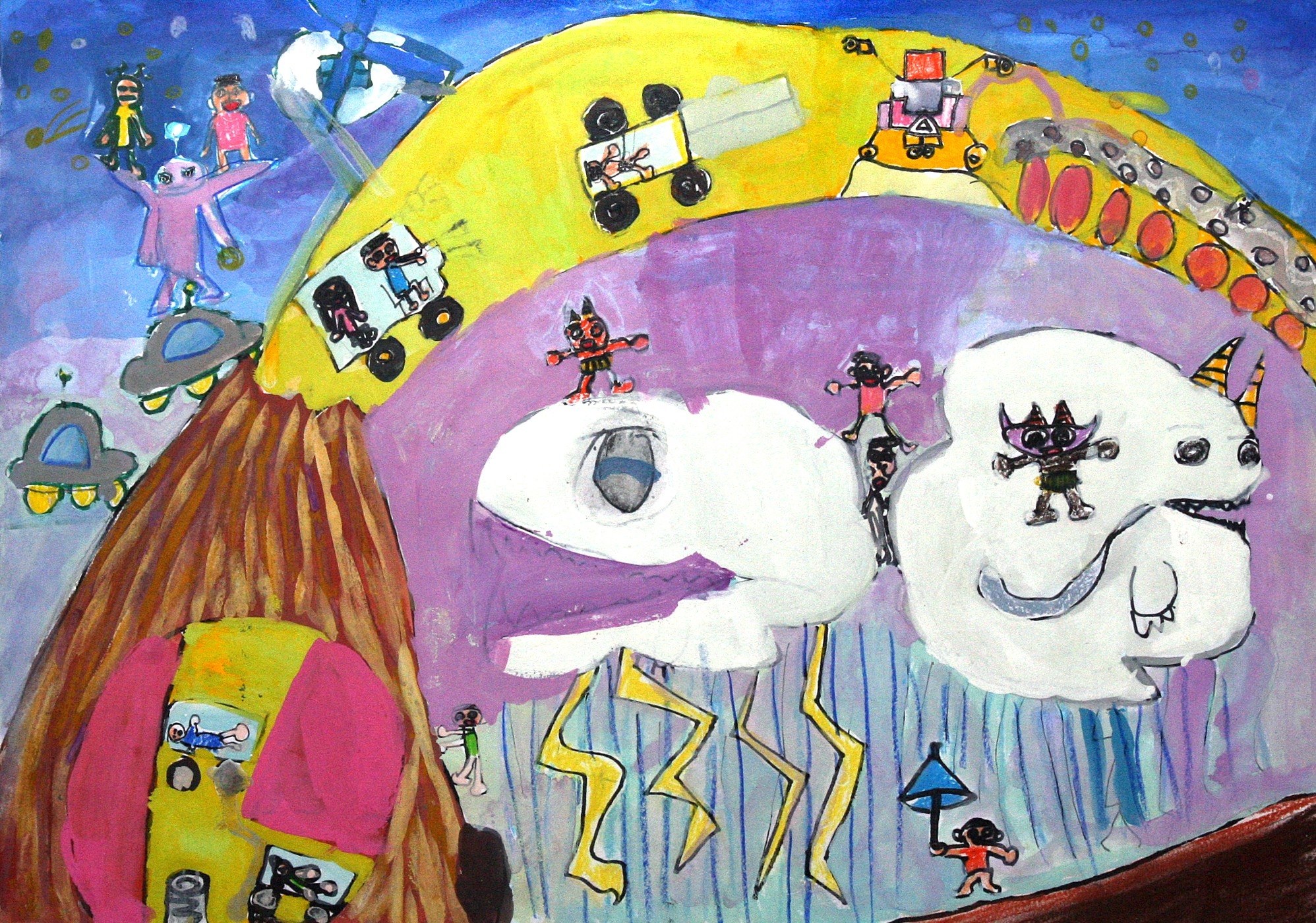 【作者コメント】虹の中を車が通れる道路です。車は山の中へ入って、バネで飛ばされて虹へ登っていきます。雲の上に鬼がのっています。雲にはさまれている人もいます。鬼のパンツにも注目してください |