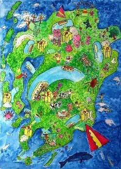【作者コメント】都市を結ぶのは、リニアモーターカーの「もっぐん」です。地下と地上を出たり入ったりします。人々が電気自動車を運んでいます。駅は、飛行場にもなっています。エネルギーは環境を考えて、地熱、風力、潮力、ソーラーパワーを使って作り出しています。九州の未来は、自然がいっぱいな、「自然きらきらランド」です。