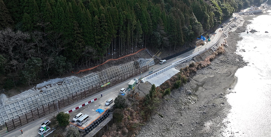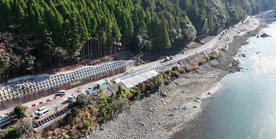 - 改良その1落石防護網施工中、改良その2,3嵩上げ工事施工中、